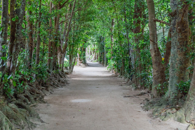 福木並木は、美ら海水族館から車で約5分ほど、伊江島を臨む備瀬の海岸線沿いに、樹齢300年を超える福木(フクギ)の木々が続く景勝地です。